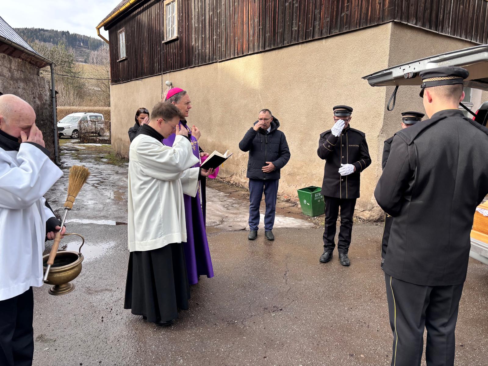 W dalszej części homilii wiele miejsca poświęcił świadectwu życia zmarłej. Wspomniał jej dzieciństwo naznaczone doświadczeniem wojny i niedostatku, młodość spędzoną na Dolnym Śląsku oraz lata pracy zawodowej w przemyśle włókienniczym. Podkreślał jej odpowiedzialność, sumienność oraz oddanie rodzinie. Ostatni etap swojej ziemskiej drogi przeżywała w hospicjum św. Ojca Pio w Świdnicy, gdzie również zapisała się jako rozmodlona, cierpliwa i umiejąca godnie przeżywać chorobę w duchu wiary. Zmarła 6 lutego 2026 r. W dniu pogrzebu obchodziłaby 89. rocznicę urodzin.