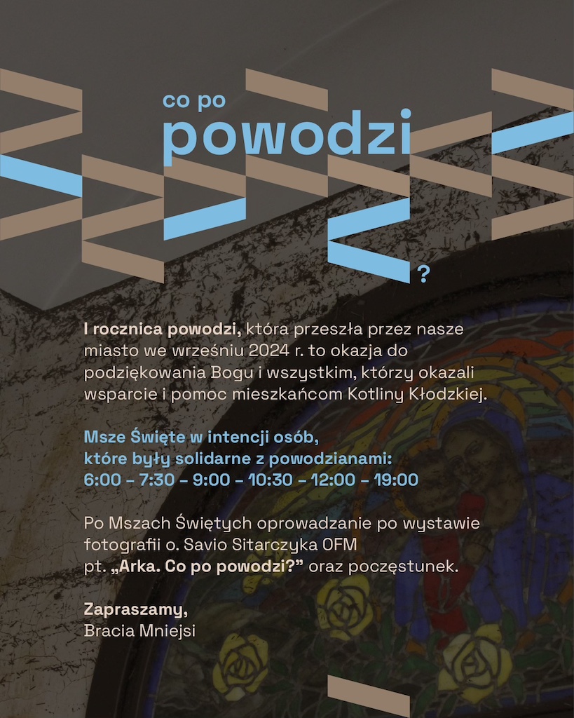 To okazja do podziękowania Bogu i wszystkim, które były solidarne z mieszkańcami Kotliny Kłodzkiej. Zapraszamy wszystkie osoby, które w zeszłym roku po powodzi okazały nam wsparcie i pomoc. Po Mszach świętych możliwość obejrzenia wystawy fotografii autorstwa o. Savio Sitarczyka pt. „Arka. Co po powodzi?” oraz poczęstunek – informują ojcowie franciszkanie z Kłodzka.