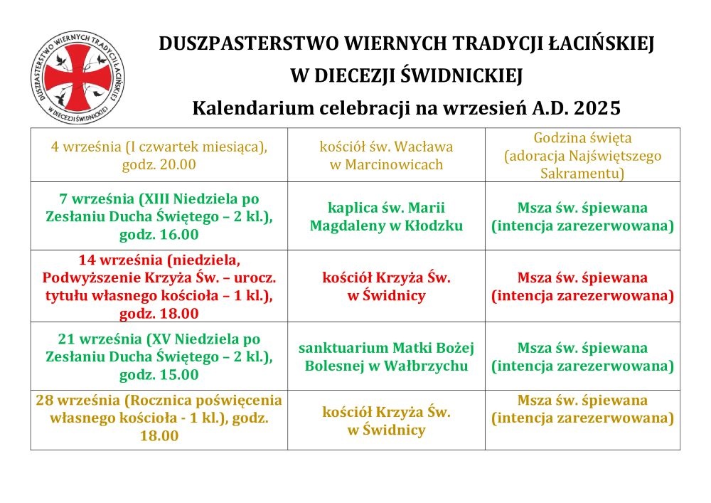 Duszpasterstwo Wiernych Tradycji Łacińskiej w Diecezji Świdnickiej opublikowało plan celebracji Mszy świętych na wrzesień 2025 r. Liturgia będzie sprawowana w Świdnicy, Kłodzku, Wałbrzychu i Marcinowicach.