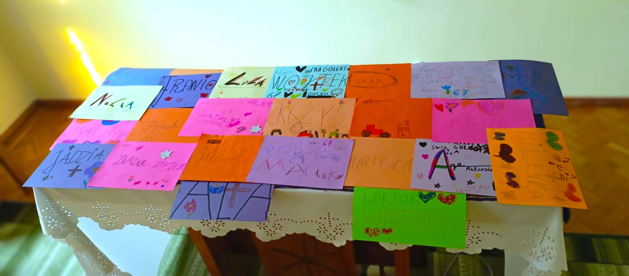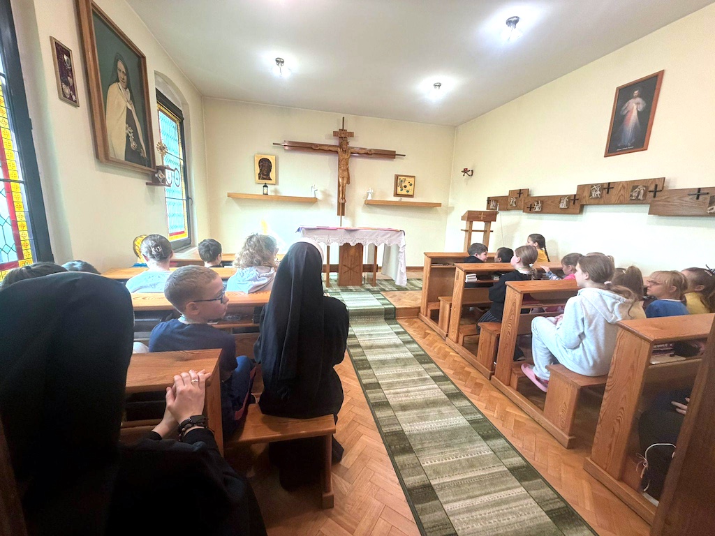 Mówiliśmy o Triduum Paschalnym. Przybliżone zostały dzieciom wydarzenia z ostatnich dni życia Jezusa Chrystusa i poprzedzające Wielką Noc. Dzieci pisały swoje imiona, po czym kartki z imionami zostały umieszczone podczas Drogi Krzyżowej w kaplicy na ołtarzu jako most do Boga Ojca, który jest w Niebie. Również, jako modlitwa za siebie nawzajem pozwalała dzieciom zrozumieć, że relacja z Bogiem jest drogą, na którą zapraszamy innych. Podczas Drogi Krzyżowej towarzyszyły nam postacie: Maryi, św. Jana Ewangelisty, św. Weroniki, Szymon z Cyreny i żołnierza rzymskiego – relacjonują siostry terezjanki, które zainicjowały spotkanie.
