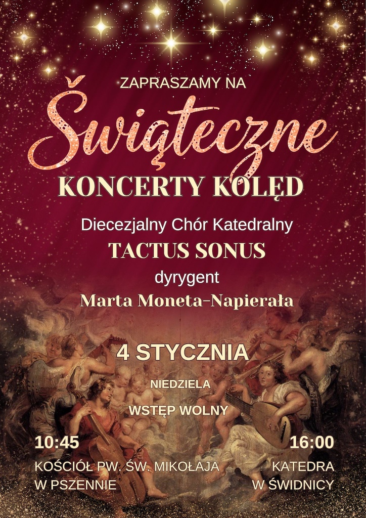 Świąteczny koncert kolęd w wykonaniu Diecezjalnego Chóru Katedralnego „Tactus Sonus” odbędzie się 4 stycznia 2026 r. o godz. 10:45 w kościele parafialnym pw. św. Mikołaja w Pszennie oraz o godz. 16:00 w katedrze pw. św. Stanisława i św. Wacława w Świdnicy.