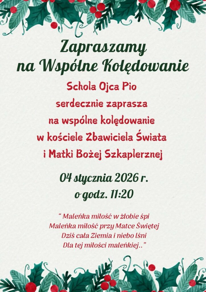 Do wspólnego kolędowania zaprasza Parafia pw. Zbawiciela Świata i Matki Boskiej Szkaplerznej w Strzegomiu. Tam 4 stycznia 2026 r. o godz. 11:20 wspólne śpiewanie poprowadzi Schola Ojca Pio.