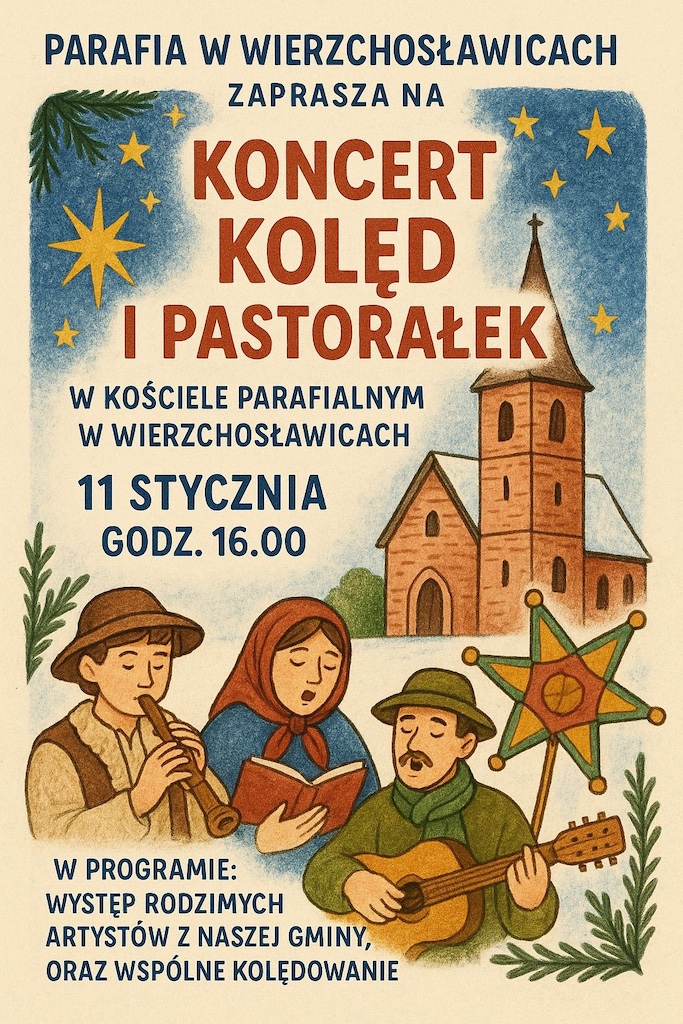 Na koncert kolęd i pastorałek zaprasza Parafia św. Józefa Oblubieńca Najświętszej Maryi Panny w Wierzchosławicach, gdzie 11 stycznia 2026 r. o godz. 16:00 do wspólnego śpiewania zaproszą miejscowi artyści.