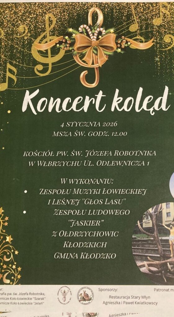 Koncert kolęd i ich wspólne śpiewanie odbędzie się 4 stycznia 2026 r. o godz. 12:00 w kościele parafialnym pw. św. Józefa Robotnika w Wałbrzychu. Animatorami wydarzenia będą zespoły śpiewacze z Gminy Kłodzko.