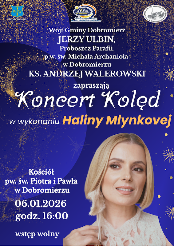 Koncert kolęd w wykonaniu Haliny Mlynkovej odbędzie się 6 stycznia 2026 r. o godz. 16:00 w kościele parafialnym pw. św. Piotra i Pawła w Dobromierzu. Wstęp wolny.