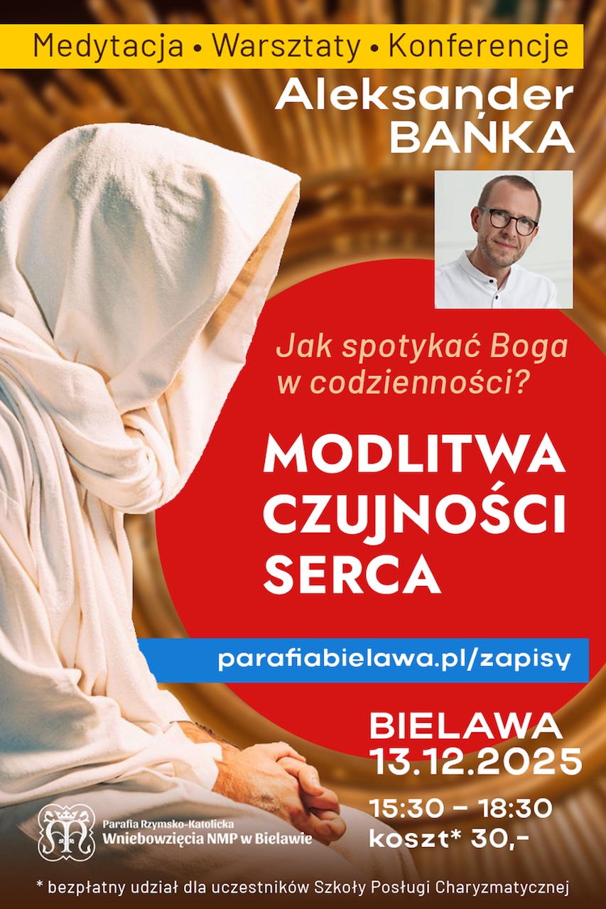 Spotkanie pod hasłem „Jak spotykać Boga w codzienności?” odbędzie się 13 grudnia 2025 r. w godz. 15:30 – 18:30 w auli Domu Parafialnego przy Parafii pw. Wniebowzięcia Najświętszej Maryi Panny w Bielawie. Koszt udziału 30 zł (dla uczestników Szkoły Posługi Charyzmatycznej bezpłatnie). Zainteresowani mogą uzyskać informacje telefonicznie (nr: 664920280).