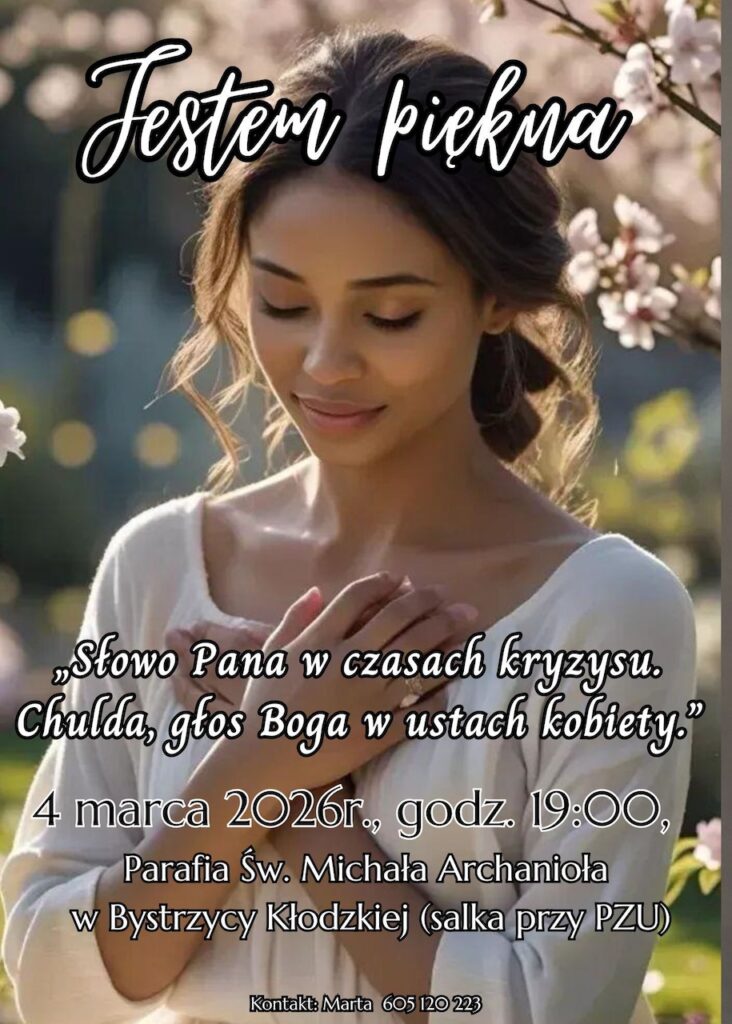 Spotkanie w cyklu „Jestem piękna” pod hasłem „Słowo Pana w czasach kryzysu. Chulda, głos Boga w ustach kobiety” odbędzie się 4 marca 2026 r. o godz. 19:00 (w salce obok PZU) z inicjatywy Parafii pw. św. Michała Archanioła w Bystrzycy Kłodzkiej.