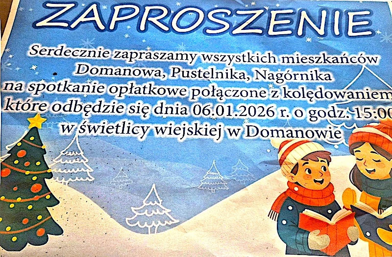 - W świetlicy wiejskiej w Domanowie spotkanie opłatkowe połączone z kolędowaniem odbędzie się 6 stycznia 2026 r. o godz. 15:00, a zaproszeni tam są przez Parafię pw. św. Józefa Oblubieńca Najświętszej Maryi Panny w Wierzchosławicach mieszkańcy Domanowa, Pustelnika i Nagórnika.