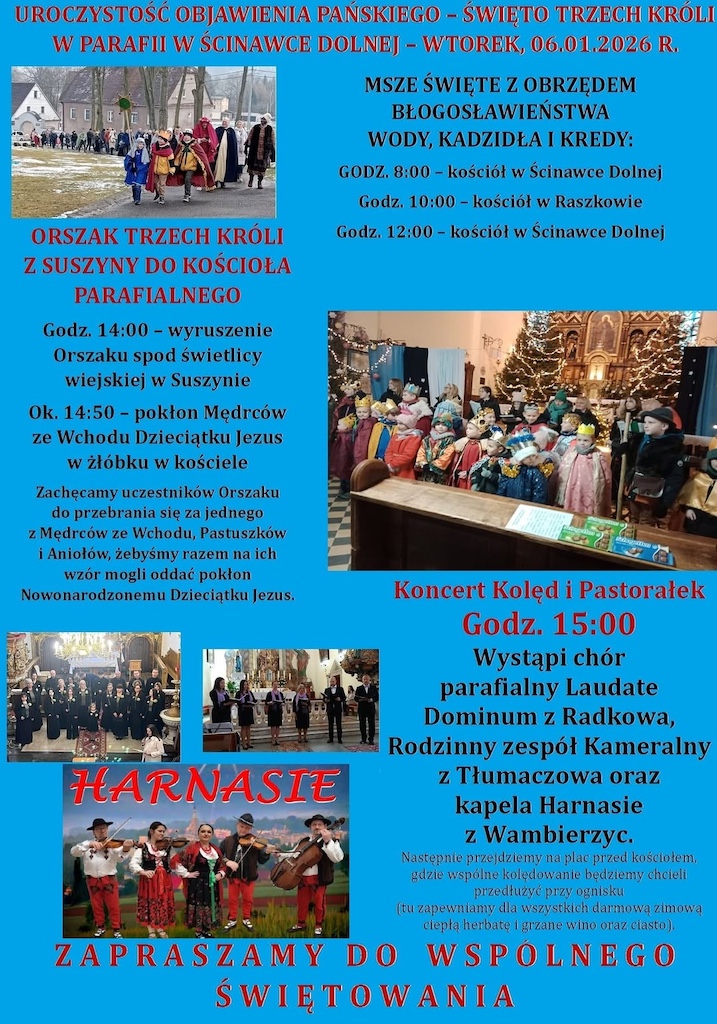 - Parafia pw. św. Jakuba Apostoła w Ścinawce Dolnej zaprasza na koncert kolędowy 6 stycznia 2026 r. o godz. 15:00 w kościele parafialnym, a po tym wydarzeniu do zagrzania się przy ognisku.