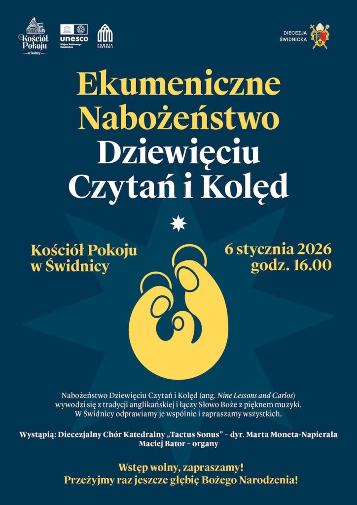 Za oknami jest biało i trzyma zimno, za to w sercach jest kolorowo, a ciepło Bożego Narodzenia rozgrzewa kościoły. 6 stycznia 2025 r. w wielu miejscowościach jasełka zabrzmią na ulicach i drogach podczas Orszaku Trzech Króli animowanego przez parafie oraz lokalne wspólnoty i instytucje kultury. Tego samego dnia czeka nas Nabożeństwo Dziewięciu Czytań i Kolęd, czyli biblijna opowieści o narodzeniu Jezusa Chrystusa. Dziewięć kolejnych czytań Pisma Świętego prowadzi przez historię zbawienia, od zapowiedzi mesjańskich po wypełnienie obietnicy w Betlejem. Każdemu czytaniu towarzyszy kolęda lub pieśń bożonarodzeniowa, która jest odpowiedzią na usłyszane Słowo. Rok temu nabożeństwo mające charakter ekumeniczny miało miejsce w katedrze pw. św. Stanisława i św. Wacława w Świdnicy. Tym razem organizatorzy, czyli Diecezja Świdnicka i Parafia Ewangelicko-Augsburska w Świdnicy zapraszają do Kościoła Pokoju 6 stycznia 2026 r. na godz. 16:00. Kolędy zaśpiewa Diecezjalny Chór „Tactus Sonus”, a słowo wygłosi ks. biskup świdnicki Marek Mendyk.