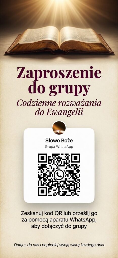 W grupie „Słowo Boże” nie musisz nic pisać ani komentować. Po prostu czytasz, kiedy masz chwilę. Jeśli chcesz codziennie masz przy sobie rozważanie Ewangelii. Jak dołączyć do grupy „Słowo Boże”? Kliknij link: https://chat.whatsapp.com/HlfX2ldbvOn8649l86vo3K?mode=gi_t lub zeskanuj kod QR z poniższej grafiki i zaakceptuj zaproszenie.