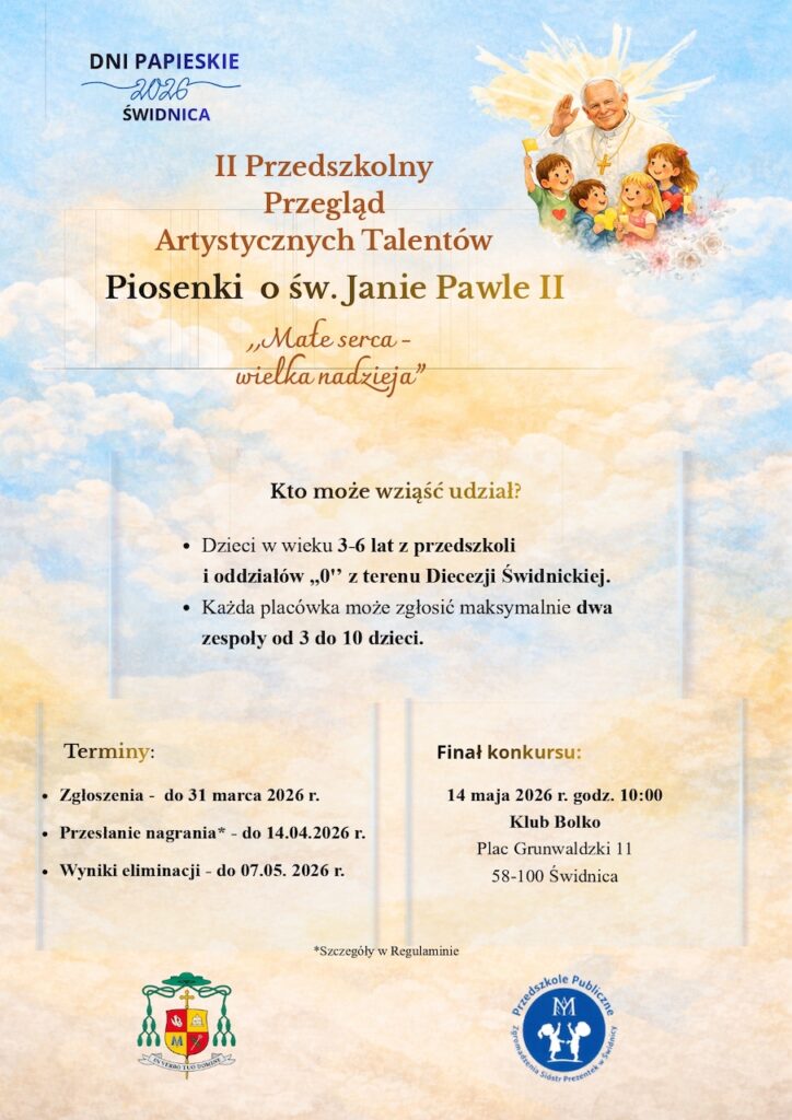 Dni Papieskie w Świdnicy to coroczny cykl koncertów, wykładów, wystaw i spotkań modlitewnych. Jednym z punktów programu będzie się II Przedszkolny Przegląd Artystycznych Talentów Piosenki o św. Janie Pawle II „Małe serca – wielka nadzieja”. Do udziału w tym wydarzeniu zaproszone są wszystkie przedszkola działające na terenie Diecezji Świdnickiej. Celem konkursu jest pogłębienie wiedzy i uczczenie pamięci pontyfikatu papieża Jana Pawła II oraz promowanie talentów muzycznych oraz wspieranie artystycznego rozwoju uczestników.