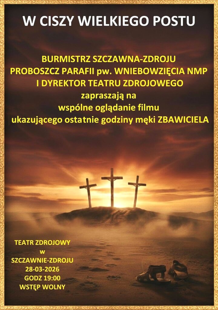 Wieczór filmowy z filmem „Pasja” Mela Gibsona odbędzie się 28 marca 2026 r. o godz. 19:00 w Teatrze Zdrojowym w Szczawnie-Zdroju. Wstęp wolny. Uwaga: film zawiera drastyczne sceny przemocy, bólu i męki, które nie służą epatowaniu przemocy, lecz mają na celu uświadomienie ogromu ceny jaką zapłacono za odkupienie człowieka. Koncert wielkopostny odbędzie się 29 marca 2026 r. o godz. 16:00 w kościele parafialnym pw. Wniebowzięcia Najświętszej Maryi Panny w Szczawnie-Zdroju. Wstęp wolny. Organizatorami obu wydarzeń jest Parafia pw. Wniebowzięcia Najświętszej Maryi Panny w Szczawnie-Zdroju oraz Gmina Szczawno-Zdrój.