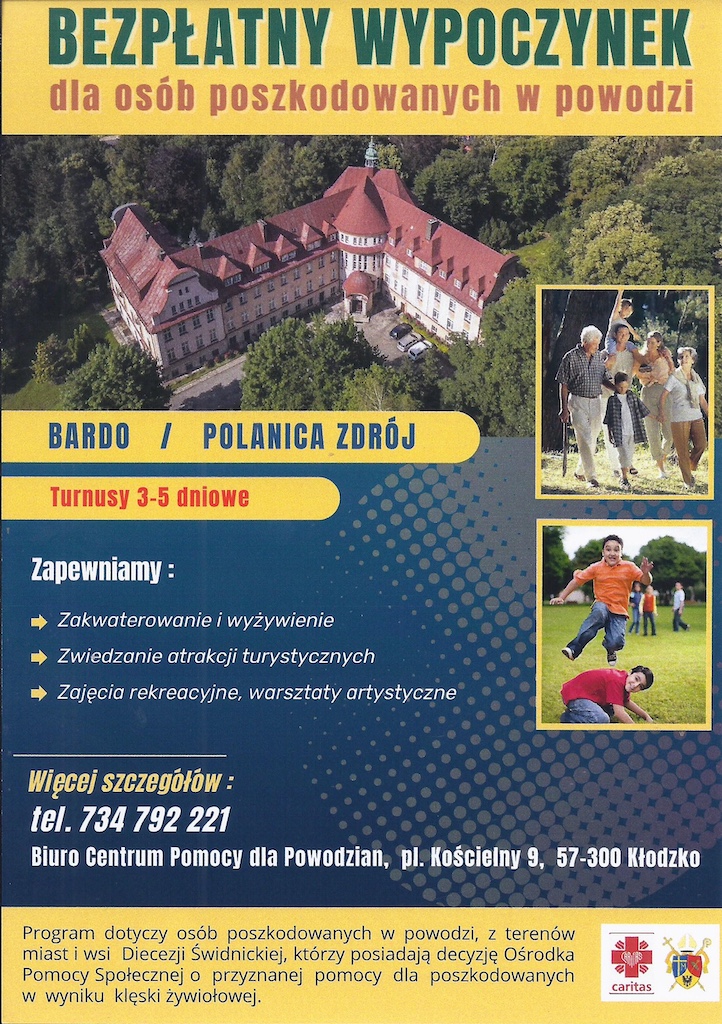 Diecezjalne oddziały Caritas, w tym Caritas Diecezji Świdnickiej, wypłacały rodzinom doraźną pomoc finansową – na dodatkowe, bieżące potrzeby. Łącznie komisje działające w diecezjach przekazały w tej formie ponad 9,42 mln zł osobom najbardziej potrzebującym. Organizowane były także wakacje, zimowiska i pobyty wytchnieniowe, aby rodziny mogły odpocząć w trakcie remontów. Caritas Diecezji Świdnickiej nadal organizuje 3- i 5-dniowe pobyty wytchnieniowe, w których mogą uczestniczyć osoby i rodziny poszkodowane w wyniku ubiegłorocznej powodzi z terenu Diecezji Świdnickiej.
