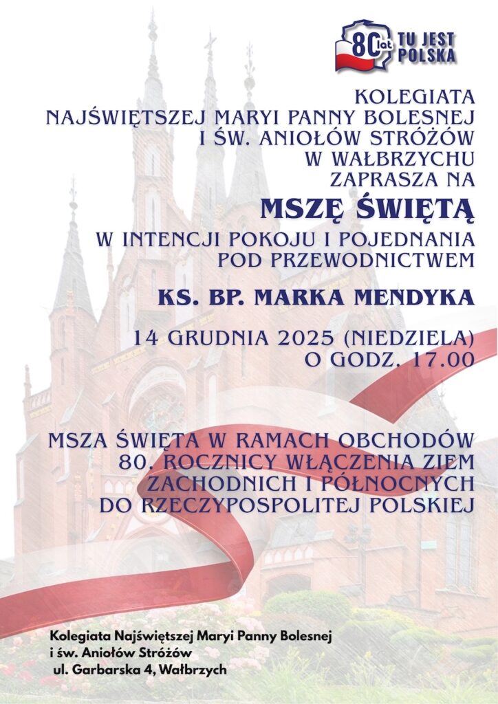 W kolegiacie pw. Najświętszej Maryi Panny Bolesnej i Świętych Aniołów Stróżów w Wałbrzychu celebrowana będzie Msza święta w intencji pokoju i pojednania. Liturgiczne wydarzenie stanowić będzie część obchodów 80. rocznicy włączenia Ziem Zachodnich i Północnych do Rzeczypospolitej Polskiej.