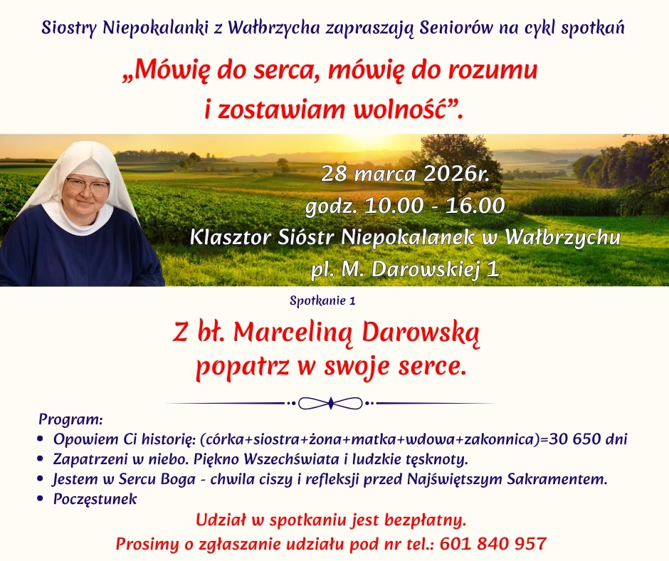 Zapraszamy na pierwsze spotkanie z cyklu inspirowanego duchowością bł. Marceliny Darowskiej pod hasłem „Mówię do serca, mówię do rozumu i zostawiam wolność”. Dlaczego warto przyjść? Bo to, by spotkać ludzi, którzy patrzą z życzliwością, słuchają bez pośpiechu i dzielą się dobrem, które umacnia, aby wrócić do domu z sercem pełniejszym nadziei – piszą siostry niepokalanki z Wałbrzycha.