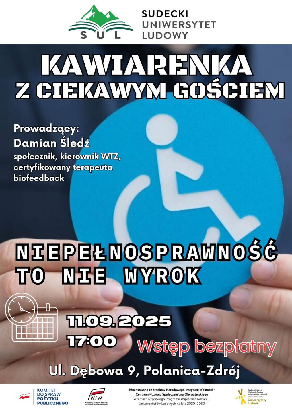 Temat spotkania: „Niepełnosprawność to nie wyrok” rozwinie i dyskusję poprowadzi Damian Śledź – społecznik, kierownik WTZ oraz certyfikowany terapeuta biofeedback. Będziemy dyskutować o życiu z niepełnosprawnością, trudnościach, z jakimi zmagają się osoby z niepełnosprawnościami oraz o ich postrzeganiu przez innych. To doskonała okazja, aby wysłuchać różnych perspektyw, wymienić się doświadczeniami oraz zbudować społeczność pełną wsparcia i zrozumienia. Nie przegapcie tej szansy na otwartą i szczerą rozmowę. Do zobaczenia – zaprasza Sudecki Uniwersytet Ludowy.