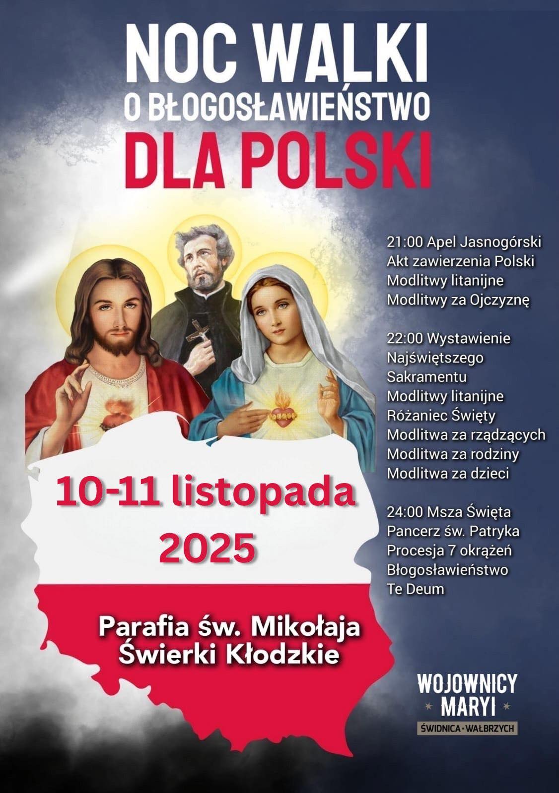 Chcący włączyć się w Noc walki o błogosławieństwo dla Polski w Diecezji Świdnickiej są zaproszeni do udziału w czuwaniu zaplanowanym na noc z 10 na 11 listopada 2025 r. w kościele parafialnym pw. św. Mikołaja w Świerkach. Wydarzenie rozpocznie się o godz. 21:00 Apelem Jasnogórskim, od godz. 22:00 rozpocznie się adoracja Najświętszego Sakramentu, o godz. 24:00 celebrowana będzie Msza św. w intencji Ojczyzny.