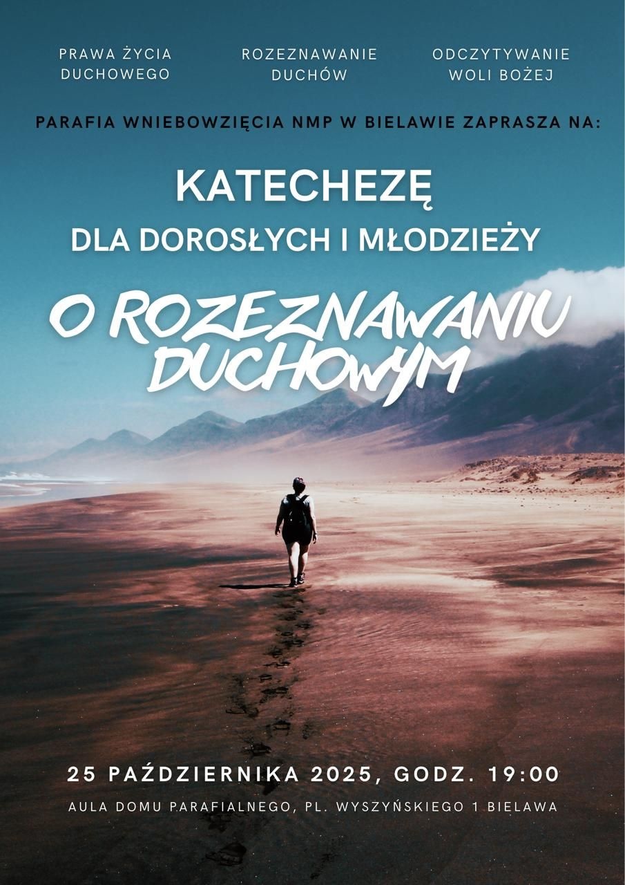 Spotkanie będzie „O rozeznawaniu duchowym”. Na katechezie poruszone będą kwestie podstawowych praw życia duchowego, zasad rozeznawania duchów i odkrywania woli Bożej w swoim życiu – informują duszpasterze Parafii pw. Wniebowzięcia Najświętszej Maryi Panny w Bielawie w Bielawie. W auli Domu Parafialnego spotkanie odbędzie się 25 października 2025 r. o godz. 19:00.