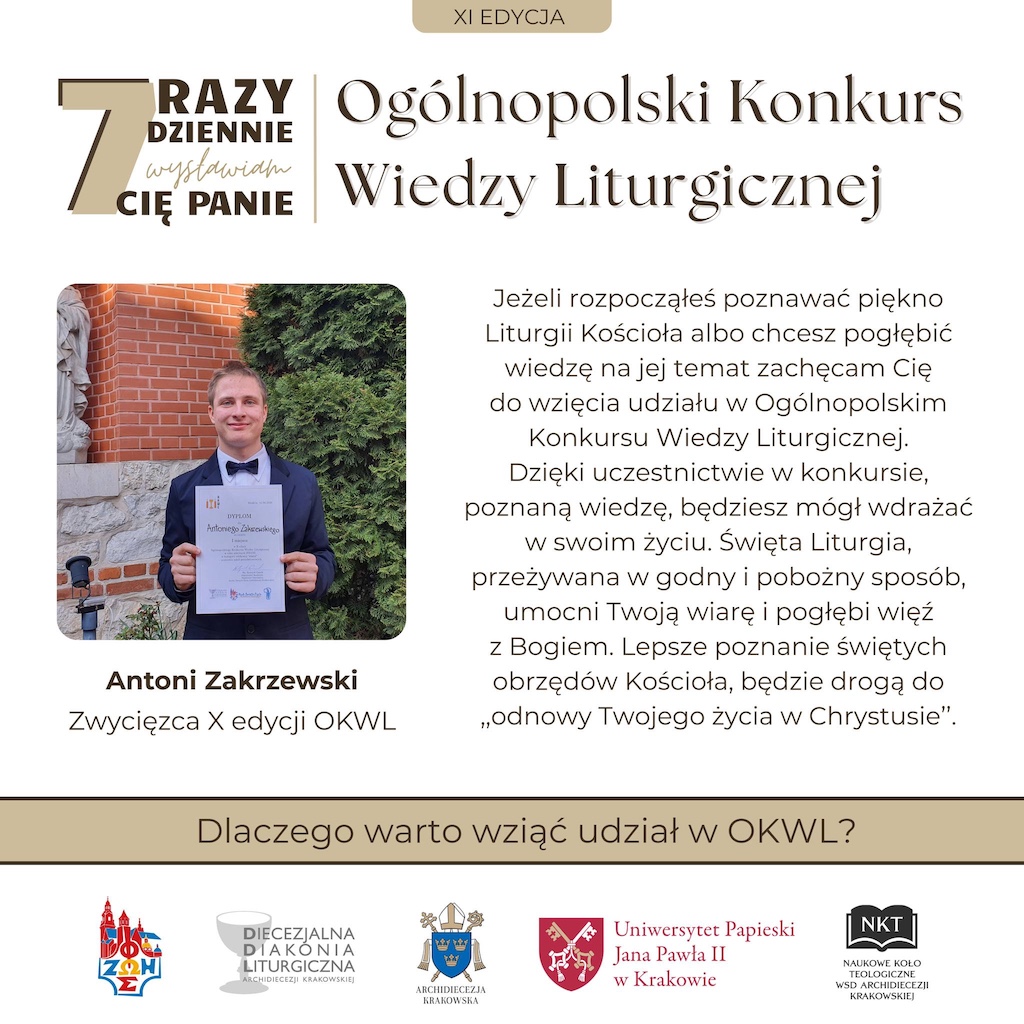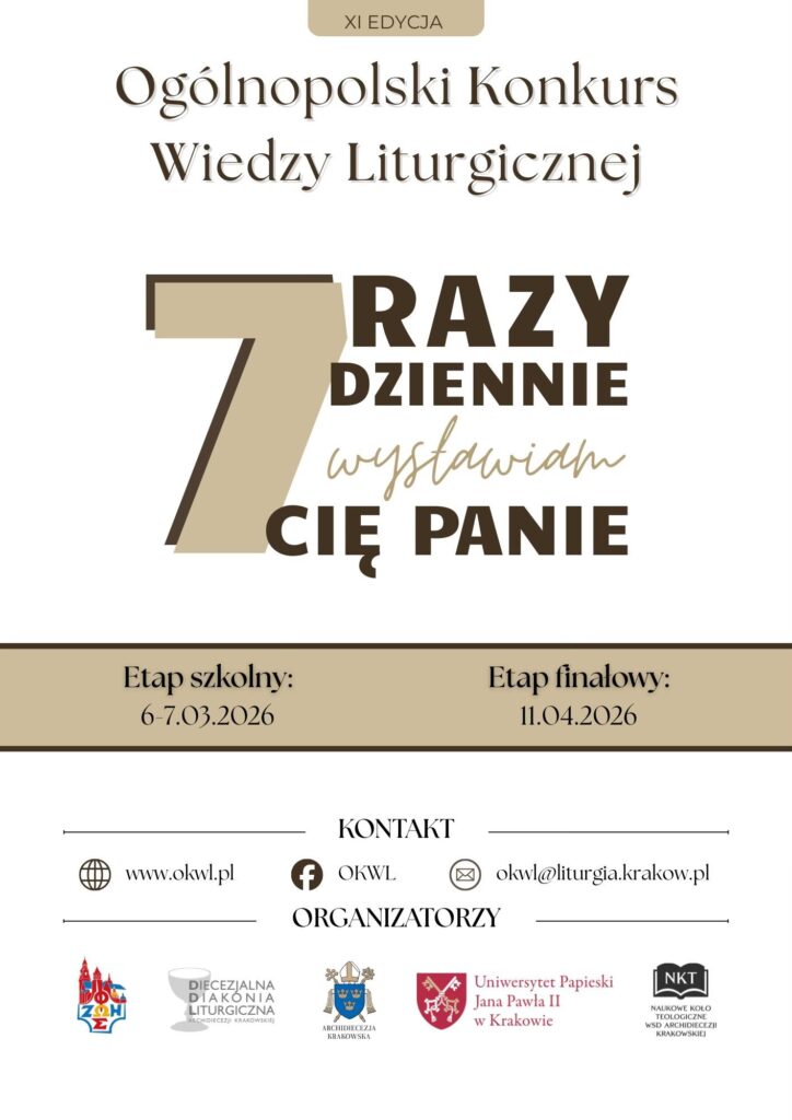 XI edycja Ogólnopolskiego Konkursu Wiedzy Liturgicznej jest organizowana przy współpracy Diecezjalnej Diakonii Liturgicznej Ruchu Światło-Życie Archidiecezji Krakowskiej i Naukowego Koła Teologicznego Wyższego Seminarium Duchownego Archidiecezji Krakowskiej, które działa przy Uniwersytecie Papieskim Jana Pawła II w Krakowie.