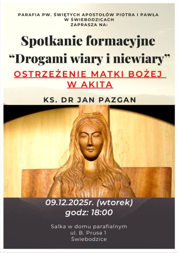 Spotkanie w ramach programu formacyjnego „Drogami Wiary i Niewiary w poszukiwaniu prawdy” poświęcone objawieniem Matki Bożej w Akita odbędzie się 9 grudnia 2025 r. o godz. 19:00 w domu parafialnym Parafii pw. świętych Apostołów Piotra i Pawła w Świebodzicach. Prelegentem będzie ks. dr Jan Pazgan z Diecezji Legnickiej.