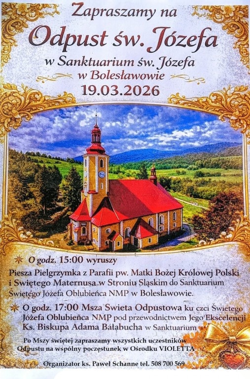 Odpust ku czci św. Józefa odbędzie się 19 marca 2026 r. Rozpocznie się o godz. 15:00 wyjściem pieszej pielgrzymki z kościoła pw. Matki Bożej Królowej Polski i św. Maternusa w Stroniu Śląskim. O godz. 17:00 Mszę św. w Sanktuarium św. Józefa w Bolesławowie celebrować będzie ks. biskup Adam Bałabuch. Po liturgii planowane jest spotkanie przy wspólnym poczęstunku.