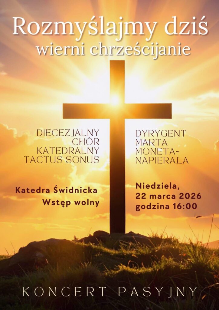 Koncert pasyjny „Rozmyślajmy dziś wierni chrześcijanie” w wykonaniu Diecezjalnego Chóru Katedralnego „Tactus Sonus” pod dyrekcją Marty Monety-Napierały odbędzie się 22 marca 2026 r. o godz. 16:00 w katedrze pw. św. Stanisława i św. Wacława w Świdnicy.