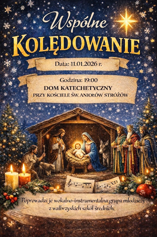 - Duszpasterze z Kolegiaty pw. Matki Bożej Bolesnej i Świętych Aniołów Stróżów w Wałbrzychu zapraszają na wspólne kolędowanie 11 stycznia 2026 r. o godz. 19:00 w Domu Katechetycznym.