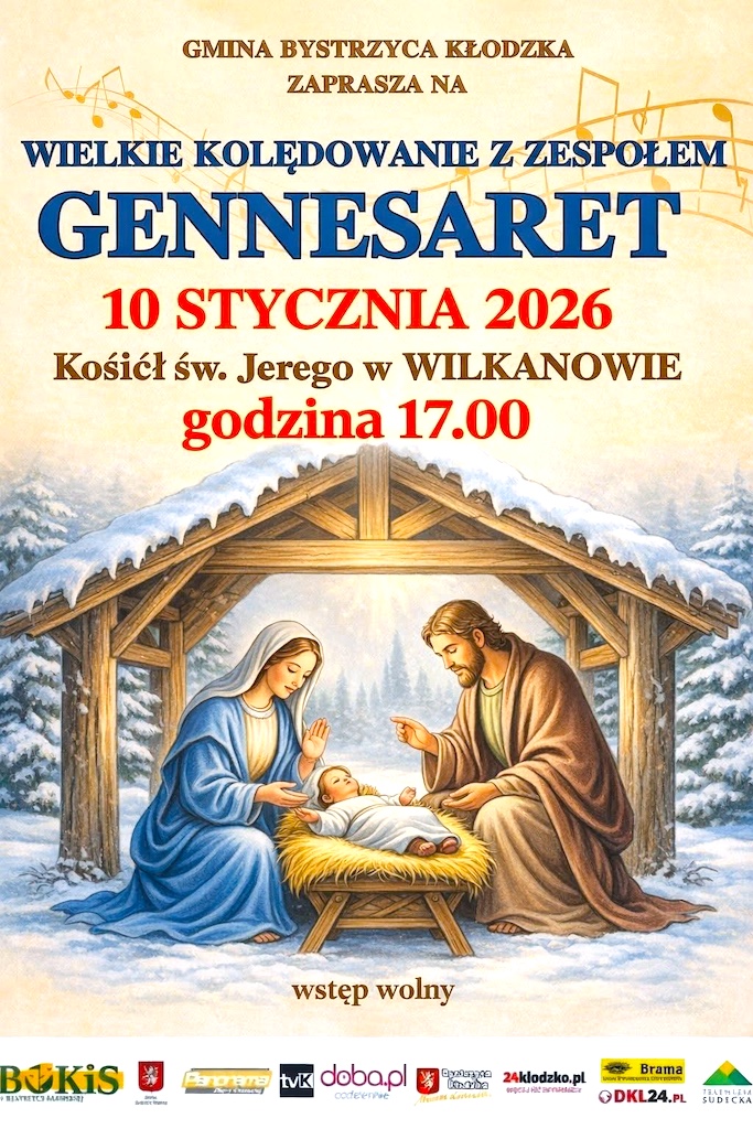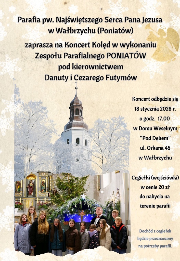 - Parafia pw. Najświętszego Serca Pana Jezusa w Wałbrzychu zaprasza na koncert kolęd i pastorałek w wykonaniu Zespołu Parafialnego pod kierownictwem Danuty i Cezarego Futymów. Wydarzenie odbędzie się 18 stycznia 2026 r. o godz. 17:00 w restauracji „Pod Dębem” na Poniatowie.