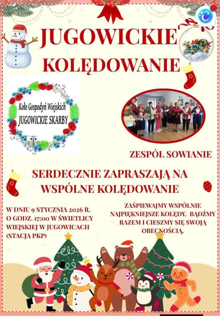 - Wspólne Jugowickie Kolędowanie organizują Koło Gospodyń Wiejskich „Jugowickie Skarby” oraz zespół „Sowianie”. Wydarzenie odbędzie się 9 stycznia 2026 r. o godz. 17:00 w świetlicy wiejskiej w Jugowicach