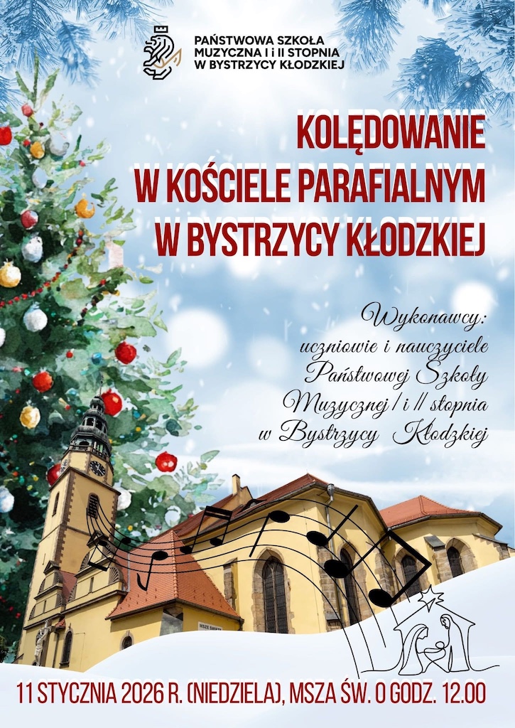 - Kolędowanie odbędzie się 11 stycznia 2026 r. o godz. 12:00 na Mszy św. w kościele parafialnym pw. św. Michała Archanioła w Bystrzycy Kłodzkiej, a wydarzenie animować będą uczniowie i nauczyciele Państwowej Szkoły Muzycznej I i II stopnia w Bystrzycy Kłodzkiej.