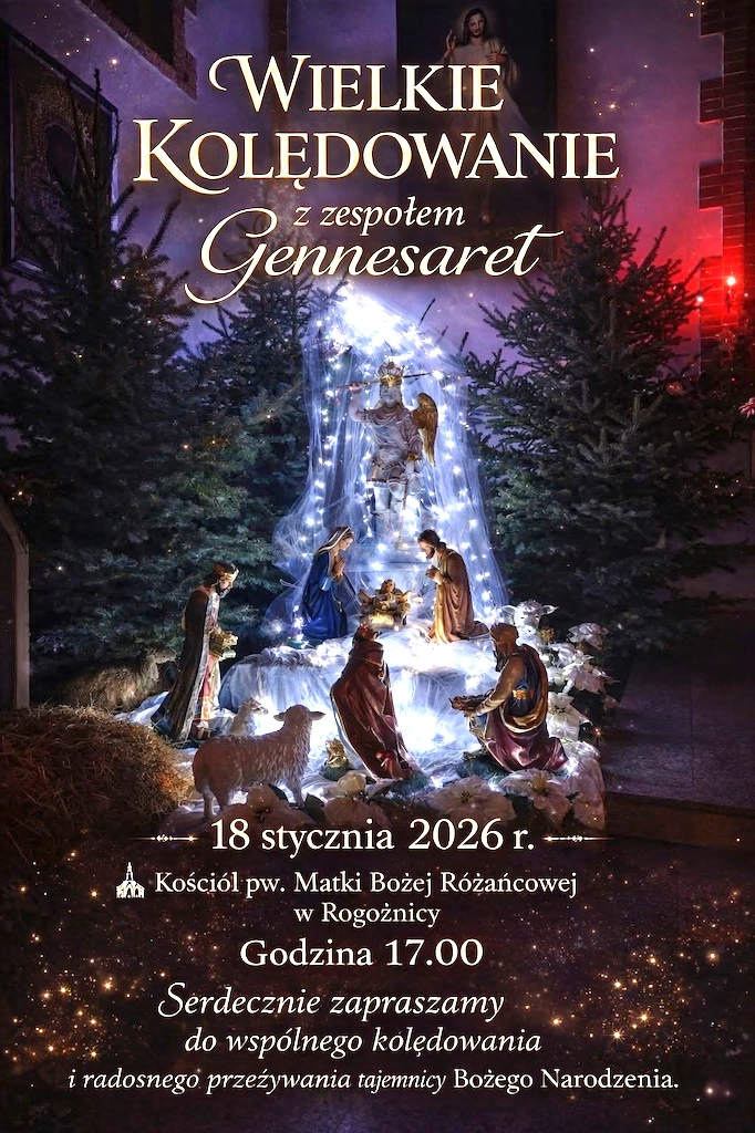 - Wielkie kolędowanie z udziałem zespołu „Gennasaret” odbędzie się 18 stycznia 2026 r. o godz. 17:00 w kościele parafialnym pw. Matki Bożej Różańcowej w Rogoźnicy.