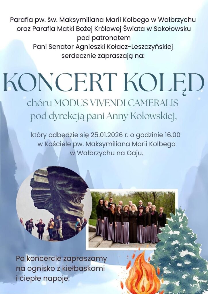 - Koncert kolęd zaplanowany jest 25 stycznia 2026 r. na godz. 16:00 w kościele parafialnym pw. św. Maksymiliana Marii Kolbego na wałbrzyskim Gaju. Śpiewać będzie Chór „Modus Vivendi Cameralis”, a po koncercie ma być ognisko z kiełbaskami i ciepłymi napojami.