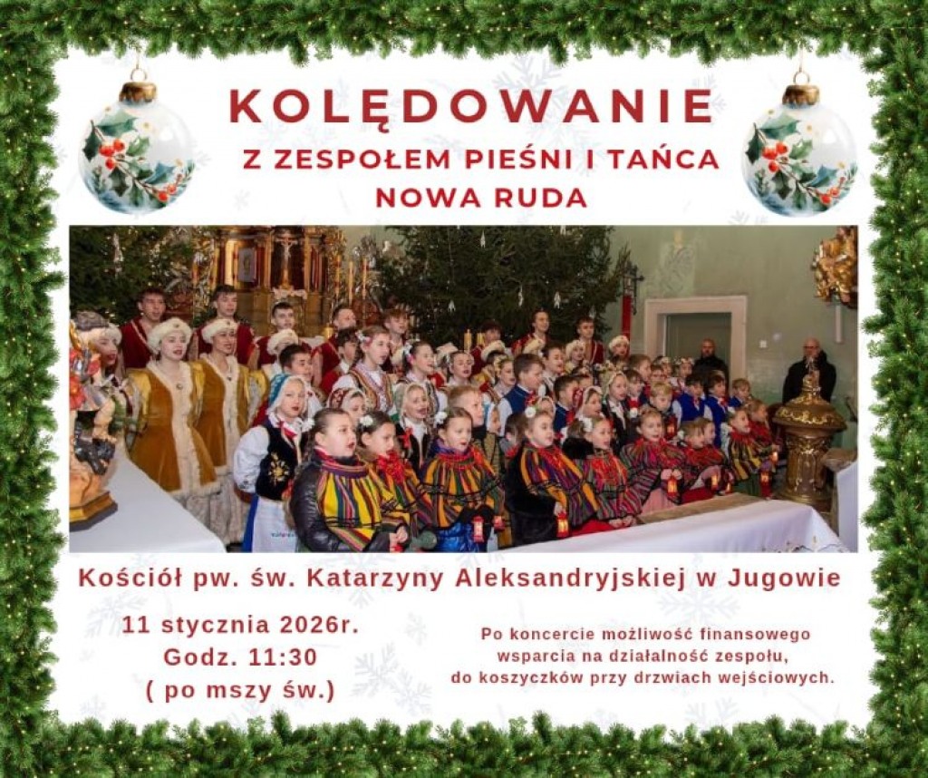 - Na kolędowanie z Zespołem Pieśni i Tańca „Nowa Ruda” zaprasza Parafia pw. św. Katarzyny Aleksandryjskiej w Jugowie na 11 stycznia 2026 r. o godz. 11:30 (po Mszy św.).