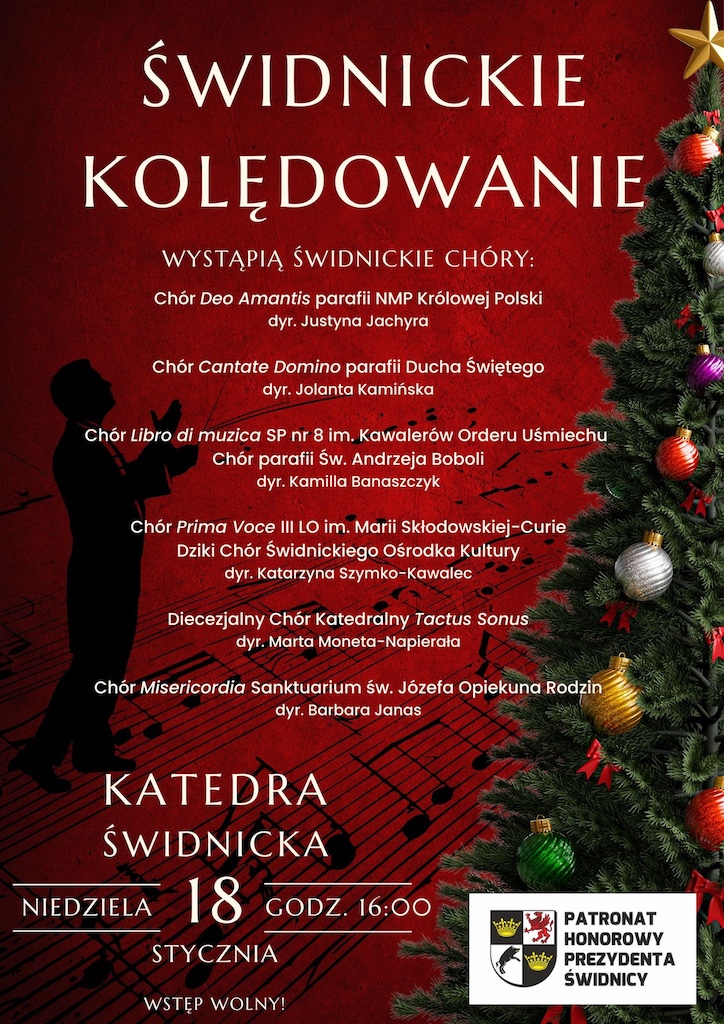 - 18 stycznia 2026 r. o godz. 16:00 w katedrze pw. św. Stanisława i św. Wacława czeka nas Świdnickie Kolędowanie z udziałem chórów: „Deo Amantis”, „Cantate Domino”, „Libro di Musica”, „Prima Voce”, „Tactus Bonus” i „Misericordia”.