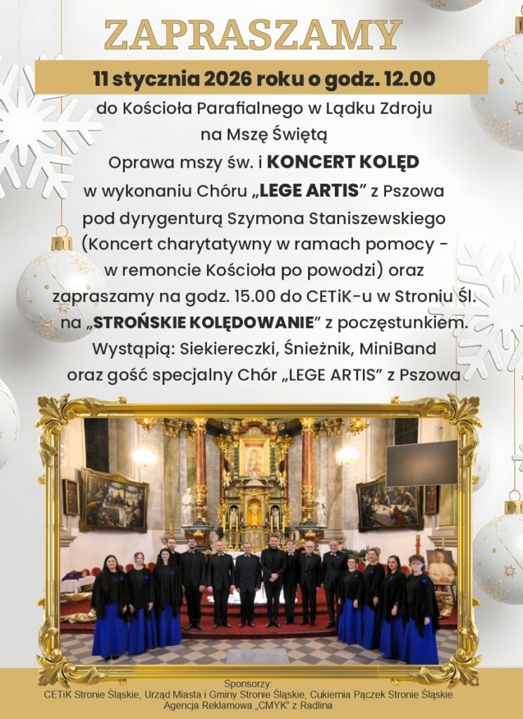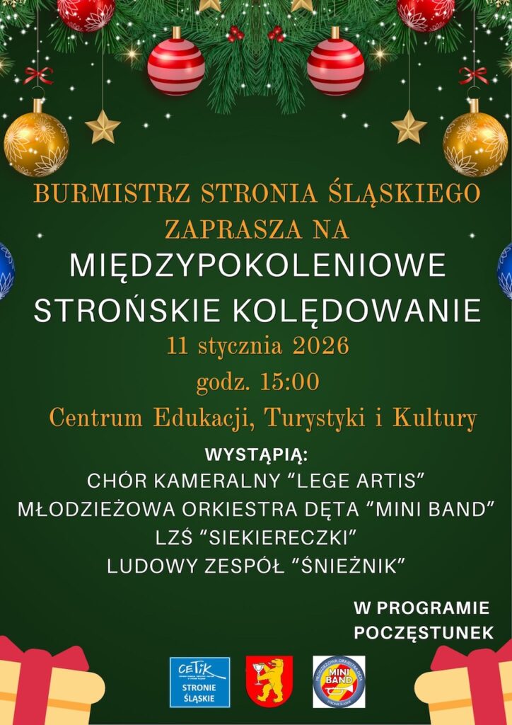 - W Centrum Edukacji, Turystyki i Sportu w Stroniu Śląskim 11 stycznia 2026 r. o godz. 15:00odbędzie się Międzypokoleniowe Strońskie Kolędowanie z udziałem Chóru „Lege Artis”, Młodzieżowej Orkiestry Dętej „Mini Band”, Ludowego Zespołu Śpiewaczego „Siekiereczki” i Ludowego Zespołu „Śnieżnik”.