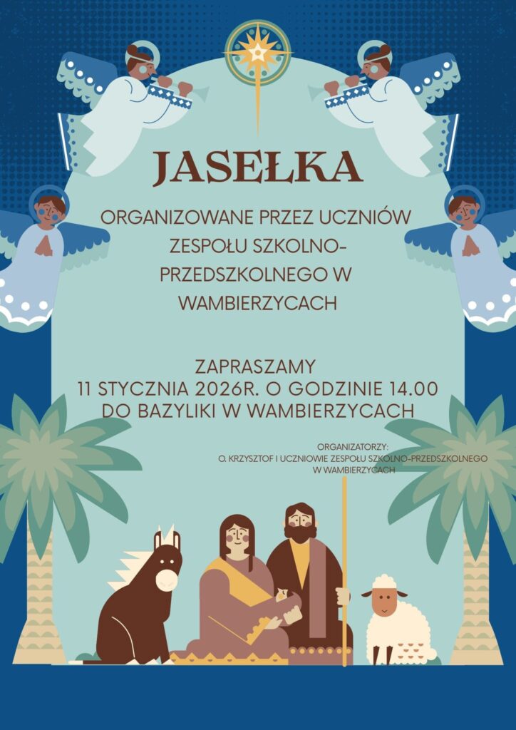 - Jasełka organizowane przez uczennice i uczniów Zespołu Szkolno-Przedszkolnego w Wambierzycach będą cieszyć serca 11 stycznia 2026 r. o godz. 14:00 w Bazylice Matki Bożej Królowej Rodzin.