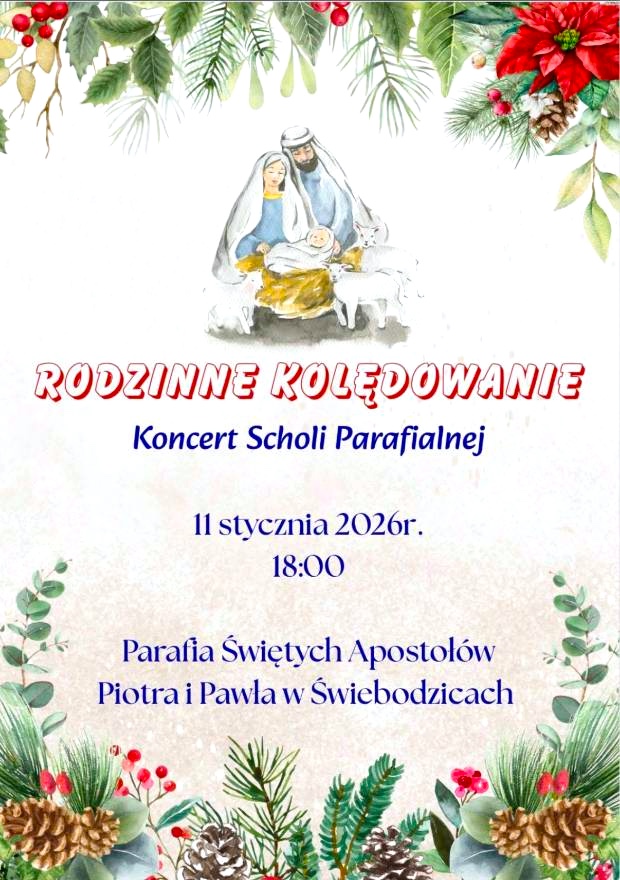 - Na rodzinne kolędowanie Parafia pw. św. Apostołów Piotra i Pawła w Świebodzicach zaprasza 11 stycznia 2026 r. na godz. 18:00.