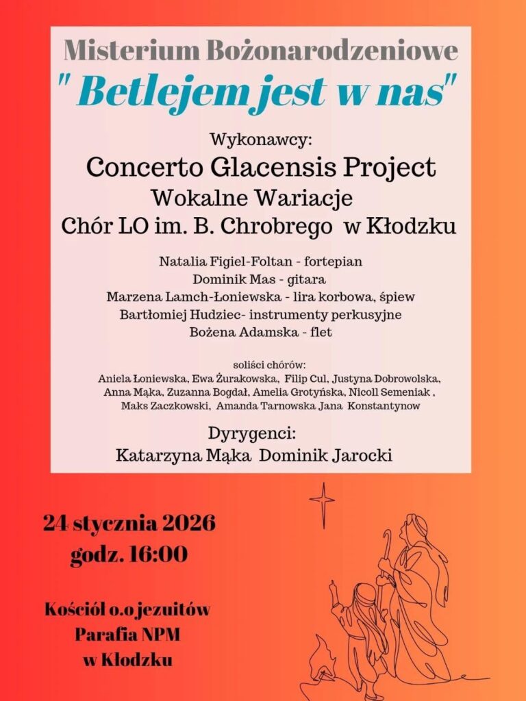 - Misterium Bożonarodzeniowe „Betlejem jest w nas” będzie można przeżywać 24 stycznia 2026 r. o godz. 16:00 w kościele parafialnym pw. Wniebowzięcia Najświętszej Maryi Panny w Kłodzku. Twórcami wydarzenia są: „Concerto Glacensis Project” oraz Chór Liceum Ogólnokształcącego im. Bolesława Chrobrego w Kłodzku.