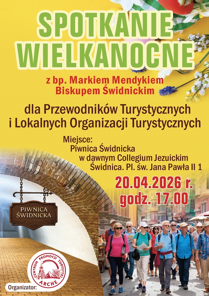 Spotkanie Wielkanocne z Biskupem Świdnickim dla przewodników i organizacji turystycznych odbędzie się 20 kwietnia 2026 r. o godz. 17:00 w Piwnicy Świdnickiej (dawne Kolegium Jezuickie, pl. św. Jana Pawła II 1) w Świdnicy. Organizatorem wydarzenia jest Centrum Promocji Turystyki „Arche”.