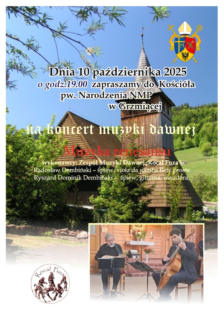 W kościele pw. Narodzenia Najświętszej Maryi Panny w Grzmiącej odbędzie się koncert „Muzyka Renesansu” w wykonaniu zespołu „Rocal Fuza” – polskiej formacji muzyki dawnej specjalizującej się w repertuarze średniowiecza i renesansu. Wydarzenie jest częścią Sudeckiego Forum Inicjatyw 2025 przebiegającego pod hasłem „Wiara – Kultura – Ekonomia”.