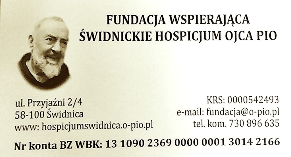 Świdnickie Hospicjum i ZOL Ojca Pio prowadzone przez Caritas Diecezji Świdnickiej od lat otacza troską osoby ciężko chore oraz wspiera ich rodziny. Każdy może włączyć się w to dzieło miłosierdzia, przekazując 1,5 procenta swojego podatku na rzecz Fundacji Wspierającej Świdnickie Hospicjum Ojca Pio (KRS 0000542493).