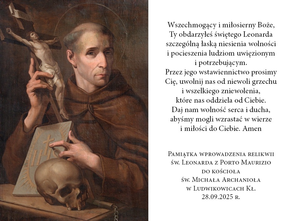 Podczas Mszy św. 28 września 2025 r. o godz. 12:00, po dokonanej renowacji relikwiarza, wprowadzimy uroczyście do naszego kościoła relikwie św. Leonarda z Porto Maurizio. W relikwiarzu znajduje się kawałek chusty nagrobnej z grobu św. Leonarda. Nie udało się ustalić jak te relikwie trafiły do naszego kościoła. Prawdopodobnie było to po kanonizacji św. Leonarda, która miała miejsce w 1867 roku, gdyż na relikwiarzu widnieje napis po niemiecku: „BITTNER – w Kłodzku 1881 rok”, który zamieścił wykonujący go znany kłodzki rzemieślnik. Odkrycie jego żywota i czczenie Świętego w jego relikwiach może przynieść wiele duchowej inspiracji i motywacji do działań dla naszej wspólnoty parafialnej. W Świętym Leonardzie, któremu będziemy oddawać cześć w jego relikwiach, zyskujemy nowego Orędownika, który jak ufam, będzie wspólnie ze Św. Janem Pawłem II wstawiał się u Boga za nami i wypraszał potrzebne łaski, byśmy podążali drogą do świętości – pisze ks. proboszcz Rafał Śliwiński w mediach społecznościowych Parafii pw. św. Michała Archanioła w Ludwikowicach Kłodzkich.