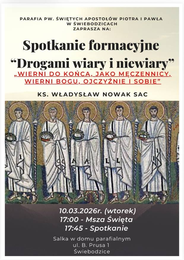 W Parafii pw. świętych Apostołów Piotra i Pawła w Świebodzicach odbędzie się kolejne spotkanie w ramach programu formacyjnego „Drogami Wiary i Niewiary. W poszukiwaniu prawdy”. Tym razem mowa będzie o pięciu młodych wychowankach oratorium salezjańskiego, którzy w 1942 r. oddali życie w obronie wiary podczas okupacji niemieckiej.